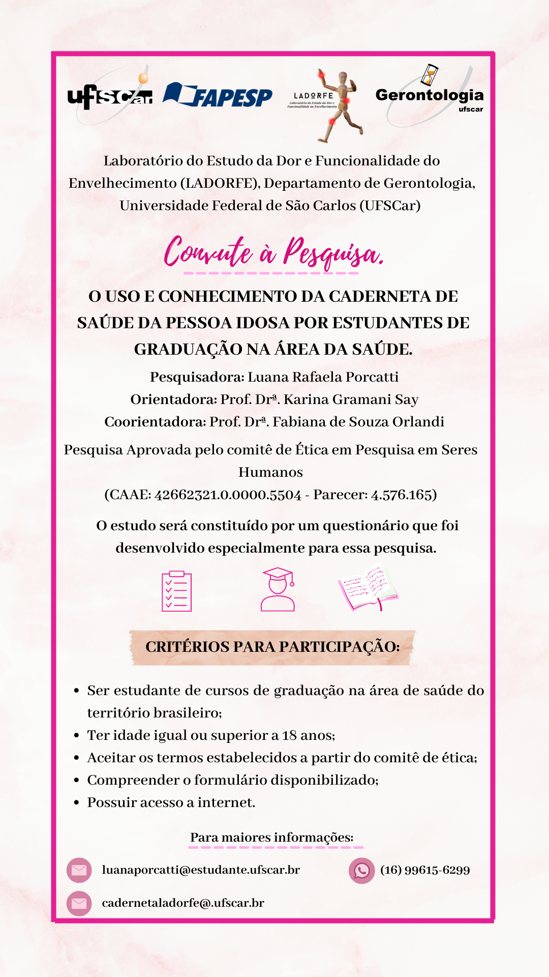 Para realizar o estudo, estão sendo convidados estudantes de graduação de cursos da área da saúde, a partir de 18 anos, de qualquer instituição brasileira. Interessados devem preencher este formulário eletrônico, que ficará disponível até o mês de junho. Mais informações podem ser solicitadas pelo e-mail luanaporcatti@estudante.ufscar.br ou pelo WhatsApp (16) 99615-6299. Projeto aprovado pelo Comitê de Ética em Pesquisa da UFSCar (CAAE: 42662321.0.0000.5504).
